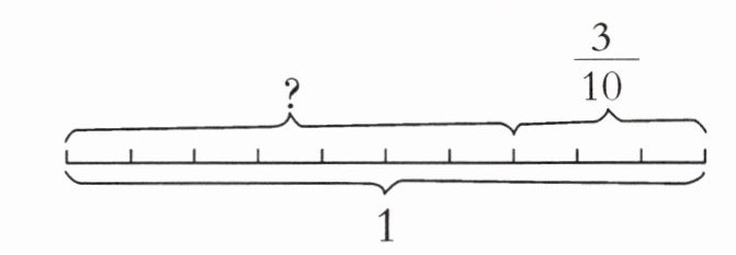对于第二幅图,整条线段表示整体1,其中一部分是$\frac{3}{10}$,求另一部分,用减法计算,即$1 - \frac{3}{10} = \frac{7}{10}$。