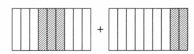 【解析】:对于第一幅图,两个长方形均被平均分成了8份。第一个长方形中阴影部分占3份,用分数表示为$\frac{3}{8}$;第二个长方形中阴影部分占2份,用分数表示为$\frac{2}{8}$。将两者相加,$\frac{3}{8}+\frac{2}{8}=\frac{5}{8}$。