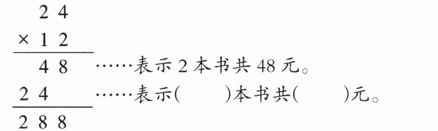 6. 一套故事书有 12 本,每本 24 元,一套书一共多少钱?小明列竖式计算: