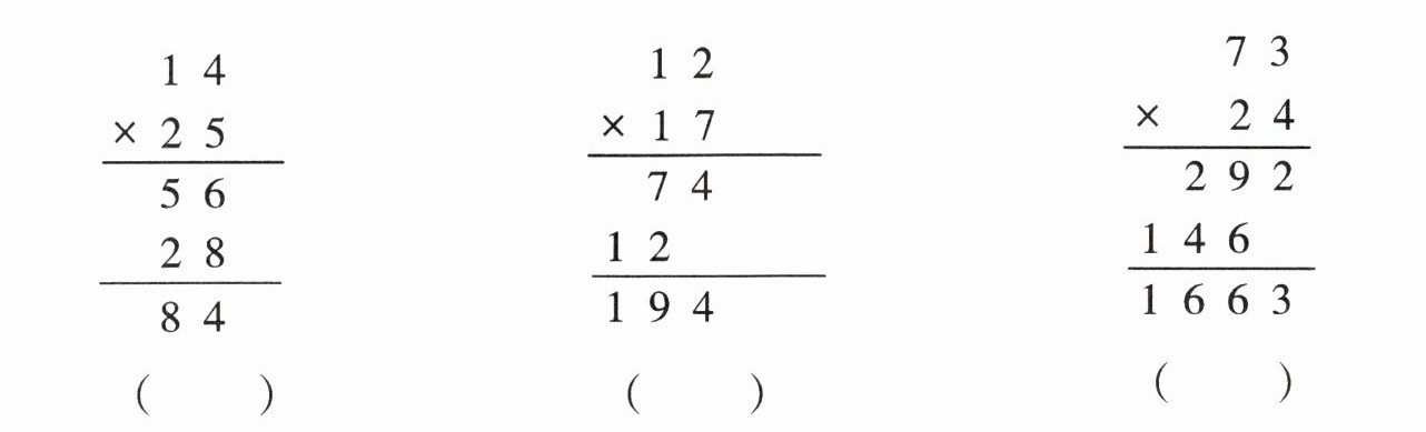 故答案依次为:×,$14×25 = 350$;×,$12×17 = 204$;×,$73×24 = 1752$。