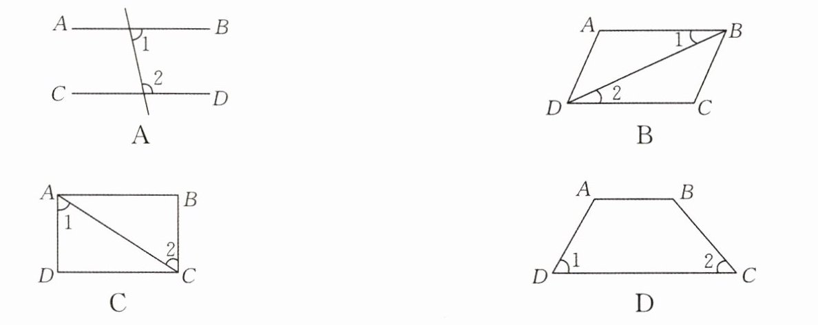 8.(★★☆☆☆)下列图形中,由$\angle1= \angle2能得到AB// CD$的是(