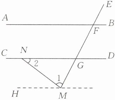 【解析】:过点$M$作$\angle HMN = \angle 2$,根据内错角相等,两直线平行,可得$HM// CD$。因为$\angle BFM = \angle 1+\angle 2$,且$\angle HMF=\angle 1 + \angle HMN$,而$\angle HMN = \angle 2$,所以$\angle BFM=\angle HMF$,根据内错角相等,两直线平行,可得$AB// HM$。由于平行于同一条直线的两条直线互相平行,所以$AB// CD$。