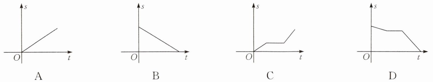 2. (★★☆☆☆)小明骑自行车上学,开始以正常速度匀速行驶,但行至中途自行车出了故障,只好停下来修车。车修好后,因怕耽误上课,就加快了骑车速度。下面是小明离家后他到学校剩下的路程s关于时间t的函数图象,那么符合小明大致行驶情况的图象是(