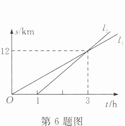 6.(★★☆☆☆)A、B两地相距$20$km,甲、乙两人都从A地去B地,图中$l_{1}和l_{2}$分别表示甲、乙两人所走路程$s$(单位:km)与时间$t$(单位:h)之间的关系.下列说法:①乙晚出发$1$h;②乙出发$3$h后追上甲;③甲的速度是$4$km/h;④乙先到达B地,其中正确的个数是(