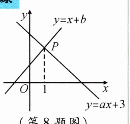 8. 如图,已知函数$y = x + b和y = ax + 3的图象相交于点P$,则不等式$x + b < ax + 3$的解集为