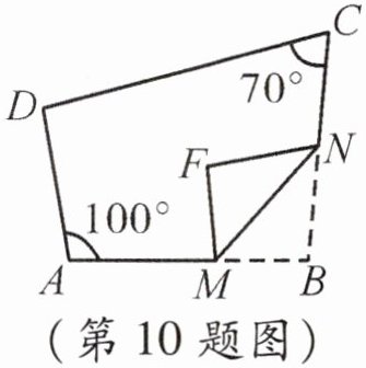 10. 如图,四边形$ABCD$中,$\angle A = 100^{\circ}$,$\angle C = 70^{\circ}$,点$M$,$N分别在AB$,$BC$上,将$\triangle BMN沿MN$翻折,得$\triangle FMN$,若$MF// AD$,$FN// DC$,求$\angle B$的度数。