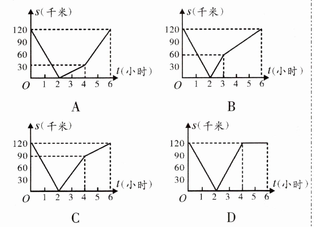 3. 已知$A$、$B两地相距120$千米,甲骑自行车以$20$千米/时的速度由起点$A前往终点B$,乙骑摩托车以$40$千米/时的速度由起点$B前往终点A$,两人同时出发,各自到达终点后停止. 设两人之间的距离为$s$千米,甲行驶的时间为$t$小时,则下列正确反映$s与t$之间函数关系的图象是 (