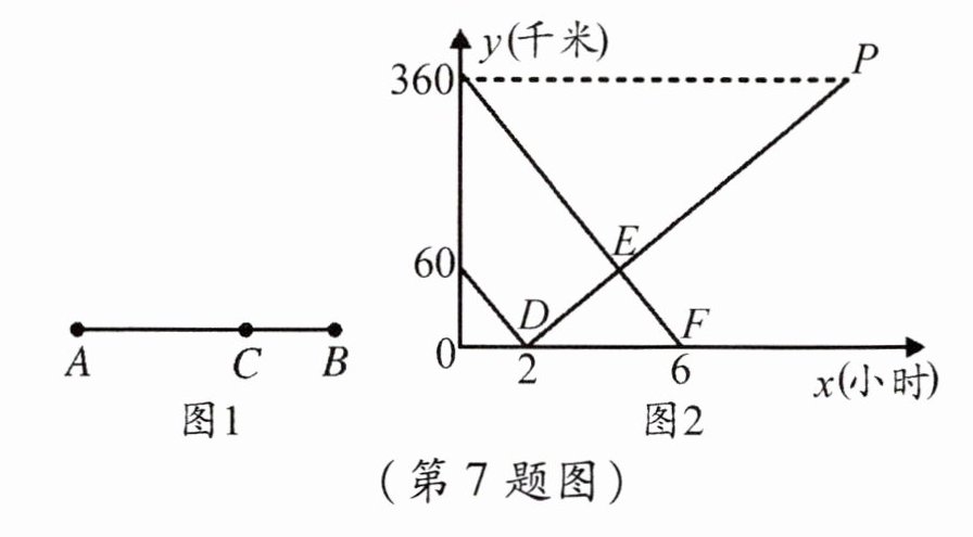 7. 如图1所示,在$A$,$B两地之间有汽车站C$站,客车由$A地驶往C$站,货车由$B地驶往A$地. 两车同时出发,匀速行驶. 图2是客车、货车离$C站的路程y_1$,$y_2$(千米)与行驶时间$x$(小时)之间的函数关系图象.