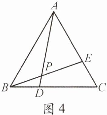 5. 如图 4,点 D、E 分别在等边 $ △ABC $的边 BC、CA 上,AD 与 BE 相交于点 P,$ ∠APE = 60^{\circ} $,求证:$ BD = CE $.