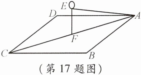 17. 如图,某公司在门前长方形小广场$ABCD$上空放一氢气球,为使氢气球悬挂于广场中央$F$的正上方,公司欲从点$A到气球E$拉一根细绳,已知小广场宽$AB = 18$米,$BC = 24$米,气球高$EF = 8$米,则细绳$AE$的长为____