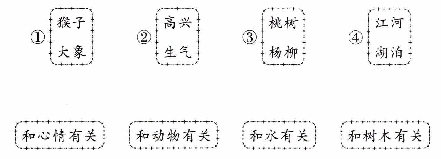①——和动物有关 ②——和心情有关 ③——和树木有关 ④——和水有关