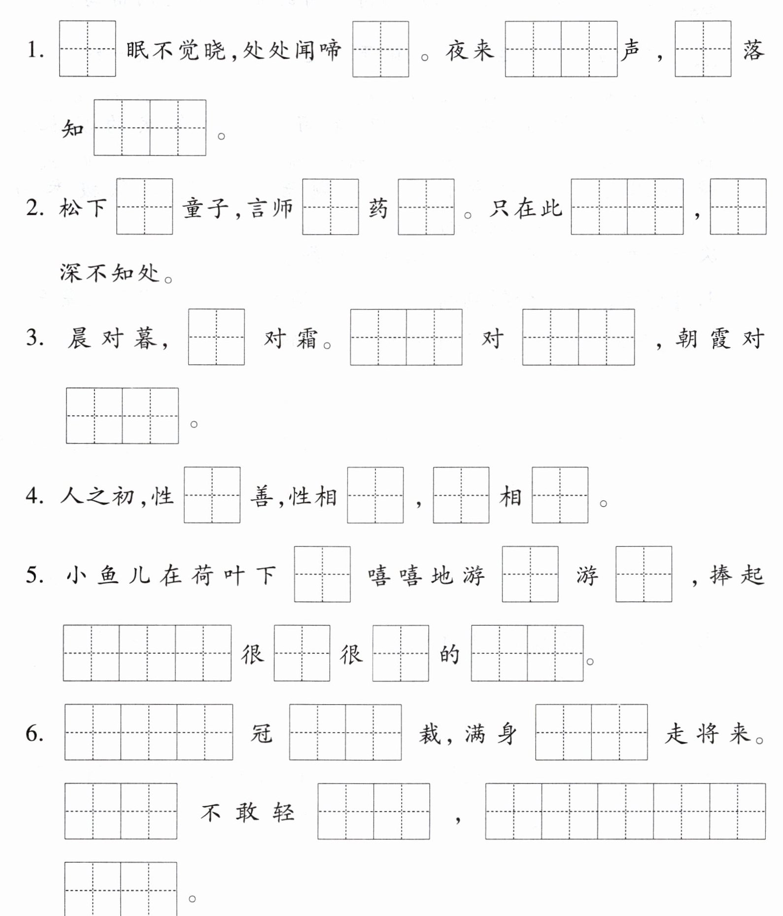 1. 春 鸟 风雨 花 多少 2. 问 采 去 山中 云 3. 雪 和风 细雨 夕阳 4. 本 近 习 远 5. 笑 来 去 一朵朵 美 美 水花 6. 头上红 不用 雪白 平生 言语 一叫千门万户开