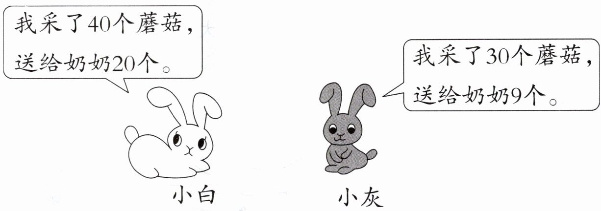 (2)40-20=20(个) 30-9=21(个) 20<21 小灰剩的蘑菇多,多21-20=1(个)。