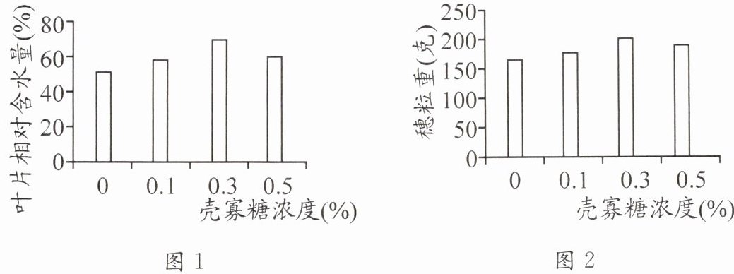 20. 水是影响干旱地区玉米产量的主要因素。为研究壳寡糖(简称COS)对玉米的抗旱能力的影响,科研人员在干旱地区选取了若干玉米幼苗并分成四组,分别将浓度为0%、0.1%、0.3%、0.5%的COS定期喷施于玉米叶表面,测定其叶片相对含水量和穗粒重,结果如图。