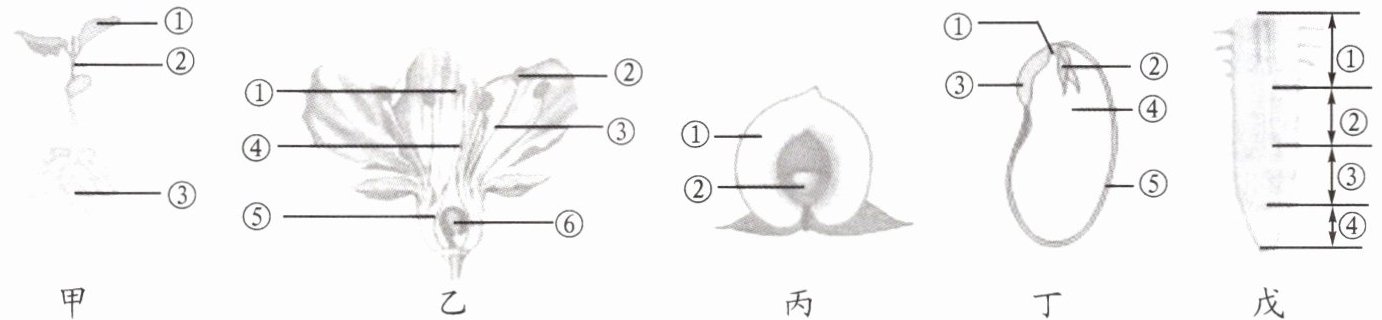 (1)图乙中一朵花的主要结构是由[①④⑤]组成的