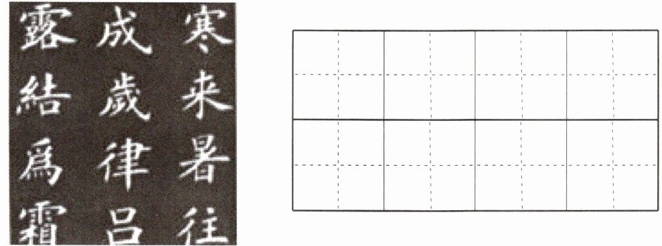 6. 请仔细观察下面的书法作品,从中挑选八个不同的简体汉字,用正楷临写在田字格内。