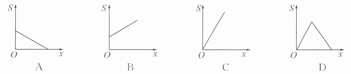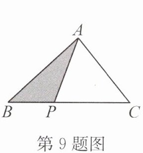 9. 如图,在 $ \triangle ABC $ 中,$ P $ 是 $ BC $ 边上一点,点 $ P $ 从点 $ B $ 出发沿 $ BC $ 向点 $ C $ 运动,到达点 $ C $ 时停止. 若 $ BP = x $,图中阴影部分面积为 $ S $,则下图中可以近似地刻画出 $ S $ 与 $ x $ 之间关系的是 (