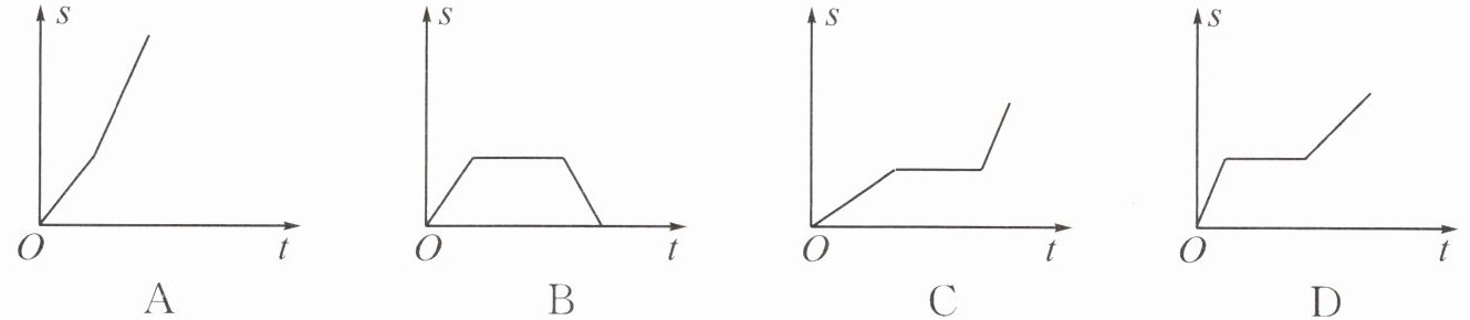 12. 罗老师骑自行车上班,最初以某一速度匀速前进,中途由于自行车发生故障,停下修车耽误了几分钟. 为了按时到校,罗老师之后加快了速度,但仍保持匀速前进,结果准时到校. 在课堂上,罗老师请学生画出:自行车行进路程 $ s(\mathrm{km}) $ 和行进时间 $ t(\mathrm{h}) $ 的大致图象,同学们画出的示意图如下,你认为正确的是 (