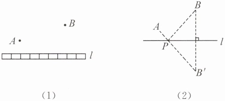 聪明的小明通过独立思考,很快得出了解决这个问题的正确办法. 他把管道 $ l $ 看成一条直线 [图(2)],问题就转化为要在直线 $ l $ 上找一点 $ P $,使 $ AP $ 与 $ BP $ 的和最小. 他的做法是这样的:
