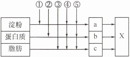 18. 如图为人体消化、吸收的过程示意图。①~⑤分别表示不同的消化液。纵向箭头表示消化液对相应营养物质的消化作用,a、b、c分别表示淀粉、蛋白质和脂肪的最终消化产物。下列相关叙述中不正确的是 (
