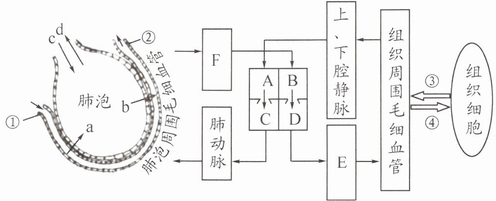 (选填“收缩”或“舒张”)状态。(4)b表示肺泡中的氧气扩散进入血液,当血液由①→②的方向流经肺泡周围的毛细血管网到达F