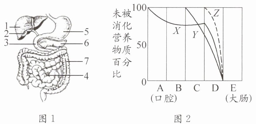 20. 图1为人体消化系统部分形态结构示意图,图2为淀粉、蛋白质、脂肪在消化道各部分被消化程度的曲线图。请据图回答下列问题: