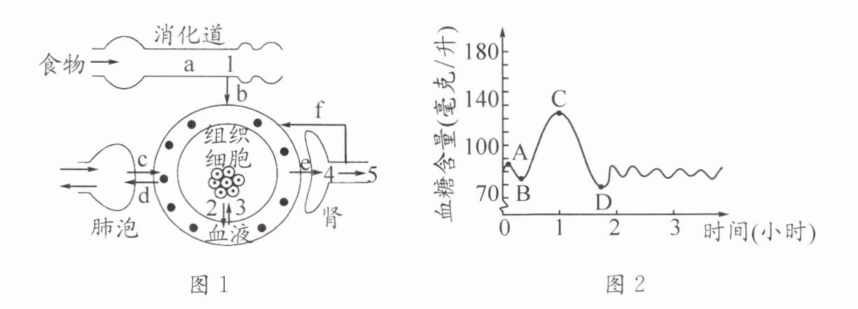 21. 人体消化、呼吸、循环、泌尿等系统之间都存在着密切的联系。图1是人体的某些生理活动示意图,图中的a~f表示生理活动过程,序号1~5表示物质;图2为正常人进食后的血糖含量变化曲线。请据图回答问题: