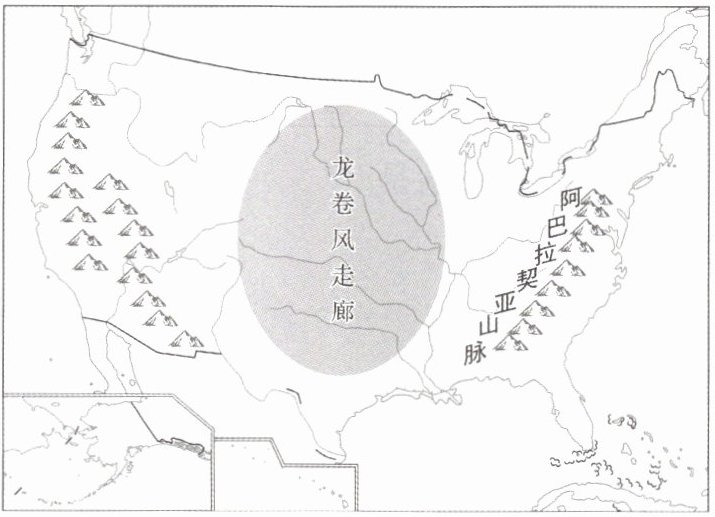 2024 年 1 月 1 日,国家主席习近平与美国总统拜登互致贺信,祝贺两国建交 45 周年。习近平在贺信中指出,中美建立外交关系是两国关系史和国际关系史上的大事件。美国农业、工业、高新技术产业在国际上均居领先地位。美国被称为“龙卷风之乡”,平均每年形成约 1000 次龙卷风。读图,完成 11~12 题。