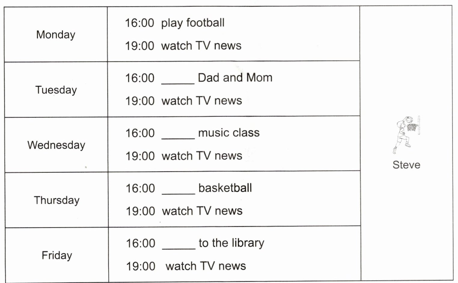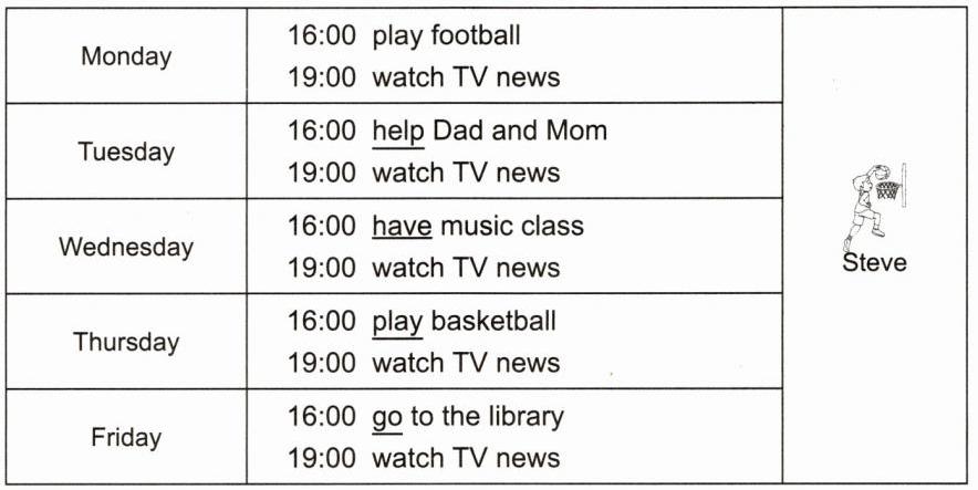 3. Read and complete. (读一读,用合适的词将 Steve 一周的部分安排补充完整。)