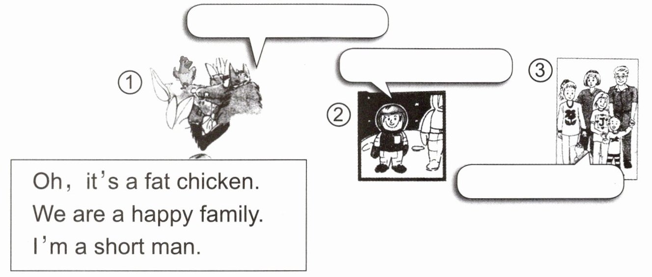 ① Oh, it's a fat chicken. ② I'm a short man. ③ We are a happy family.
