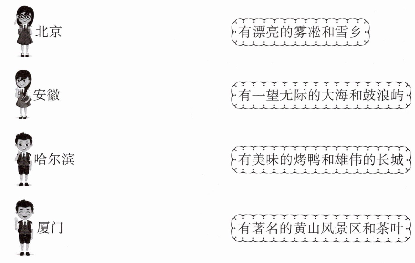【解析】:本题可根据所给城市的特点,结合常识来进行连线。北京有著名的长城;安徽有著名的黄山风景区;哈尔滨冬季有漂亮的雾凇,是雪乡所在地;安徽有茶叶,同时厦门是沿海城市,有一望无际的大海和鼓浪屿。