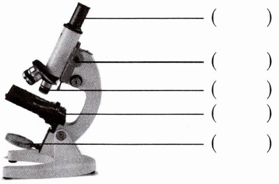 1. 在上面显微镜的图中标出相应部分:载物台、目镜、反光镜、物镜、调节旋钮。