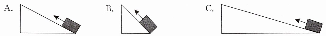 3. 把相同的重物沿着不同的斜面向上提升,下图中最省力的是( )。