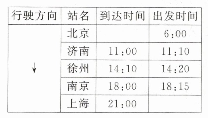 【解析】:1. 从北京出发时间是6:00,到达济南时间是11:00,行驶时间用到达时间减去出发时间,即11时 - 6时 = 5小时。