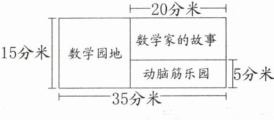 “数学家的故事”和“动脑筋乐园”组成一个宽为20分米的长方形,它们的总高度与大长方形的高度15分米相同。其中“动脑筋乐园”的高度为5分米,所以“数学家的故事”的高度为:$15 - 5 = 10$(分米)。