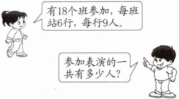 【解析】:要计算参加表演的总人数,可先算出每个班的人数,再乘以班级数。每个班站6行,每行9人,那么每班人数为每行人数乘以行数,即$6×9 = 54$人。一共有18个班,所以总人数为每班人数乘以班级数,即$54×18$。计算$54×18$时,先算$50×18 = 900$,再算$4×18 = 72$,最后将两者相加$900 + 72 = 972$人。