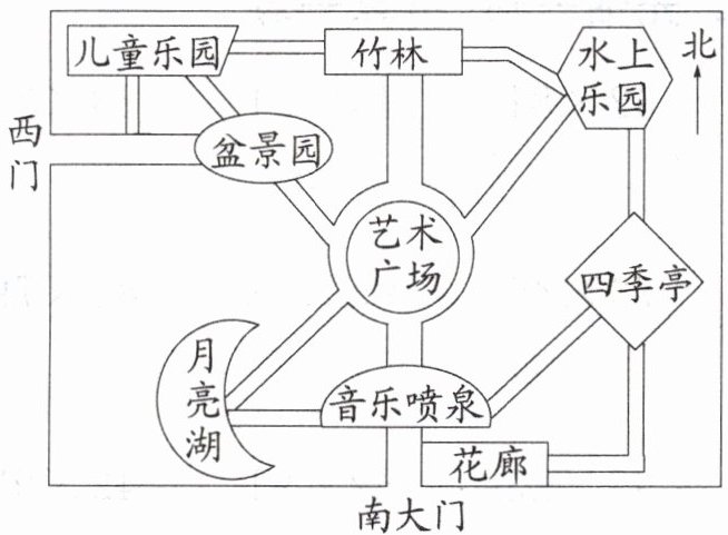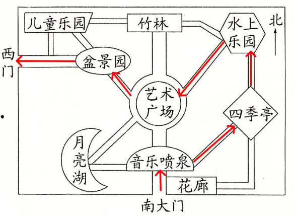 小东从南大门进入公园,游览了音乐喷泉、四季亭、水上乐园、艺术广场和盆景园,从西门出公园。在图上画出小东的游览路线。