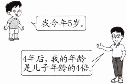 【解析】:根据题目信息,儿子今年5岁。4年后儿子的年龄为$5 + 4 = 9$岁。因为4年后爸爸的年龄是儿子年龄的4倍,所以4年后爸爸的年龄为$9×4 = 36$岁。那么爸爸现在的年龄就是4年后的年龄减去4,即$36 - 4 = 32$岁。