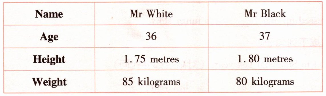 Hi, everyone. We have two new teachers. They are Mr White and Mr Black. Mr White is 36 years old. He is 1.75 metres and 85 kilograms. Mr Black is a little older. He is 37 years old. And he is 1.80 metres. But he is thinner than Mr White. He is 80 kilograms.