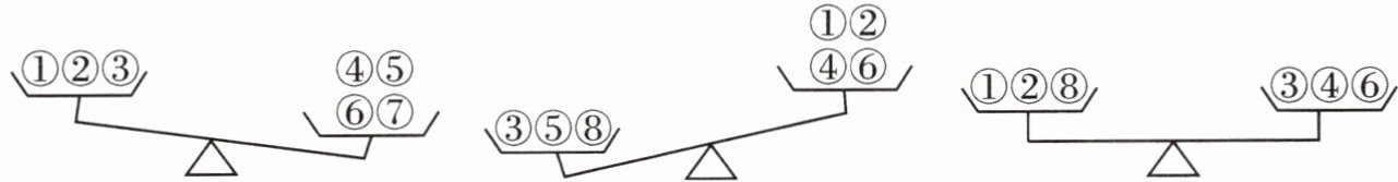 五、有 6 个重 1 克的球,1 个重 2 克的球,1 个重 3 克的球,把这 8 个球从①到⑧编上号,放到天平上称,状态如下图所示。