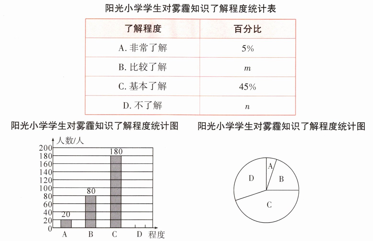 3. 为了调查学生对雾霾知识的了解程度,阳光小学在学生中做了一次抽样调查。了解程度分为四个等级:A.非常了解;B.比较了解;C.基本了解;D.不了解。根据调查结果,同学们绘制了下面的三种统计图表。
