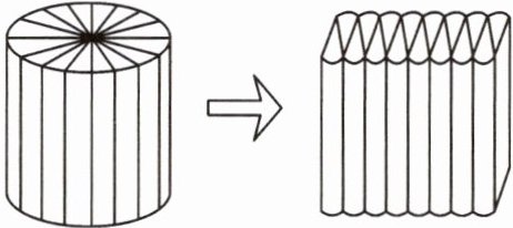 10. 如右图所示,把底面半径4厘米的圆柱切成若干等份,拼成一个近似的长方体。这个长方体的表面积比原来增加了80平方厘米,那么长方体的高是(