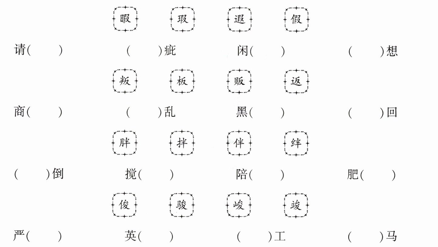 假 瑕 暇 遐 贩 叛 板 返 绊 拌 伴 胖 峻 俊 竣 骏