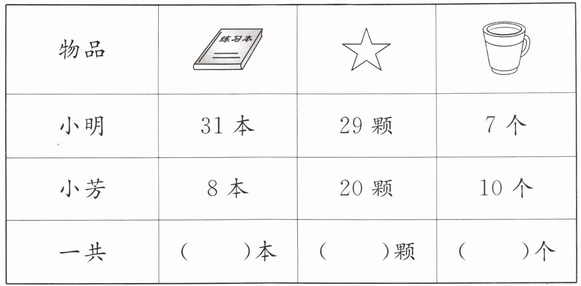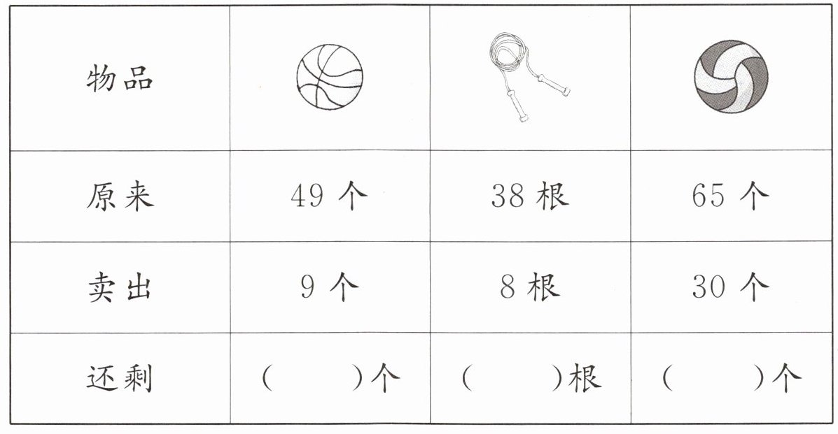 解析:第一组物品考查两位数加一位数、整十数的加法。第二组物品考查100以内数的减法。