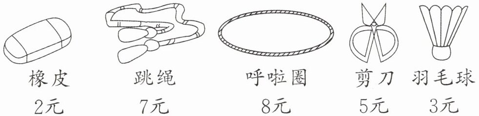 答案:用10元钱正好能买橡皮和呼啦圈或者跳绳和羽毛球而不找零。