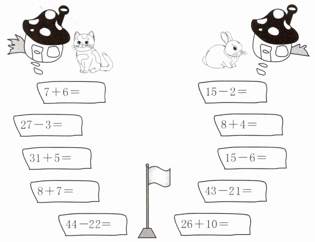 答案:$7 + 6 = 13$;$15 - 2 = 13$;$27 - 3 = 24$;$8 + 4 = 12$;$31 + 5 = 36$;$15 - 6 = 9$;$8 + 7 = 15$;$43 - 21 = 22$;$44 - 22 = 22$;$26 + 10 = 36$。