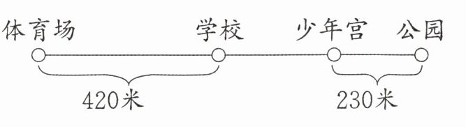 【解析】:从体育场到公园的总距离是960米,体育场到学校是420米,少年宫到公园是230米。那么学校到少年宫的距离可以用总距离减去体育场到学校的距离,再减去少年宫到公园的距离,即$960 - 420 - 230$。先算$960 - 420 = 540$(米),再算$540 - 230 = 310$(米)。