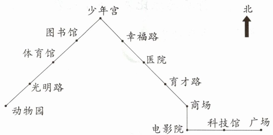 (2)从动物园出发,向右上方(东北)行驶4站到少年宫;从少年宫向右下方(东南)行驶3站到商场;从商场向下(南)行驶1站到电影院;从电影院向右(东)行驶2站到广场。