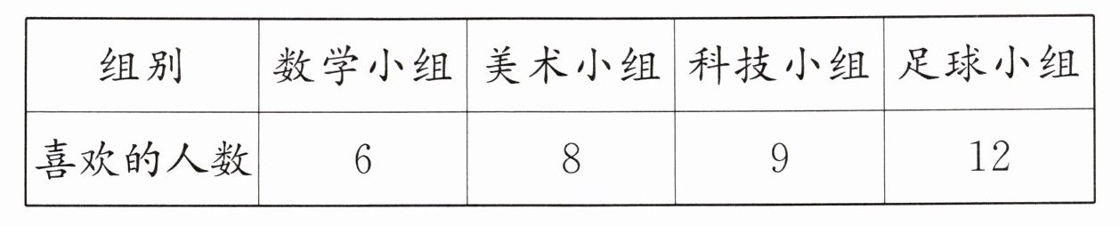 因为$6\lt8\lt9\lt12$,所以喜欢足球小组的人数最多,喜欢数学小组的人数最少。