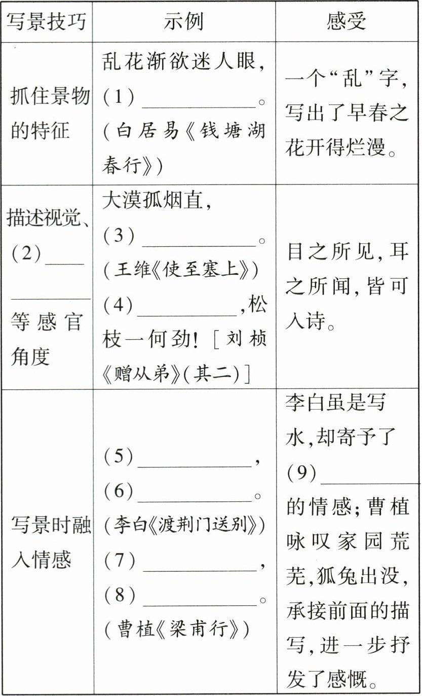| 写景时融入情感 | (5)______,(6)______。(李白《渡荆门送别》)(7)______,(8)______。(曹植《梁甫行》) | 李白虽是写水,却寄予了(9)______的情感;曹植咏叹家园荒芜,狐兔出没,承接前面的描写,进一步抒发了感慨。 |
